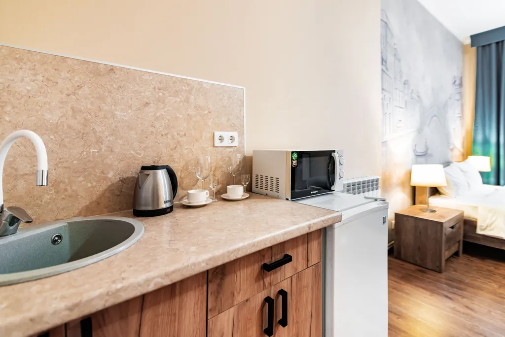 Для вашего удобства, в апартаменте также имеется мини-кухня с микроволновкой, холодильником, чайником и всем необходимым для приготовления еды, чая и кофе.