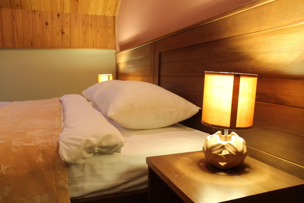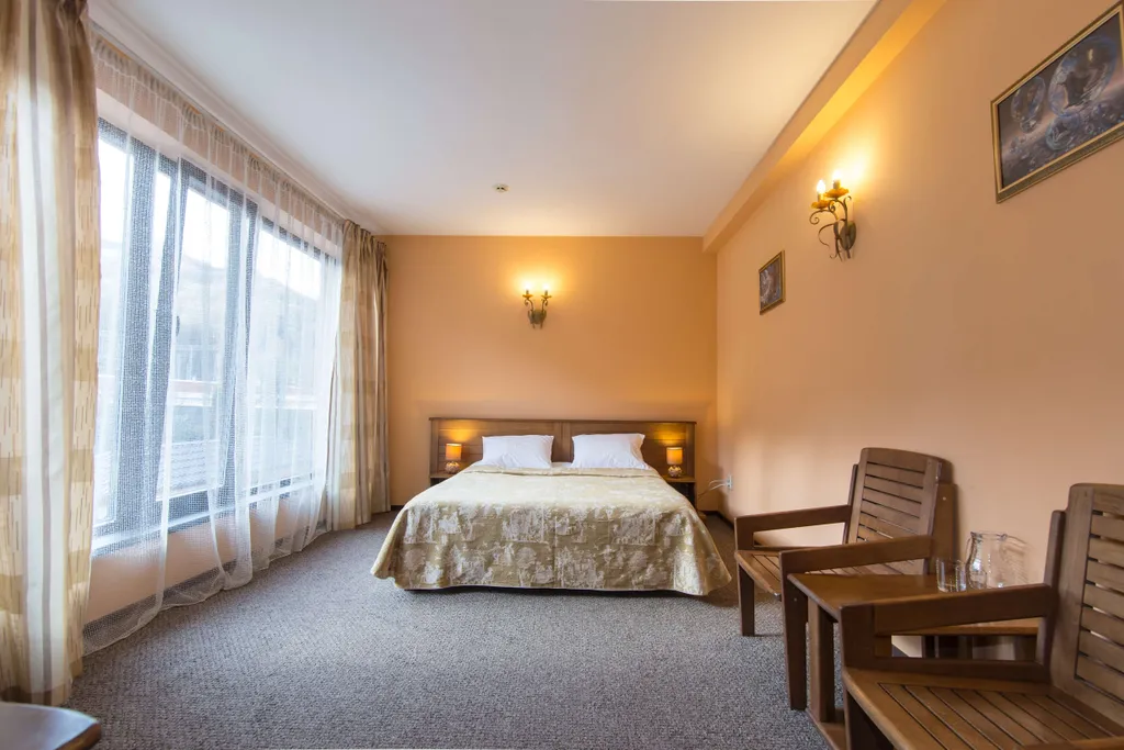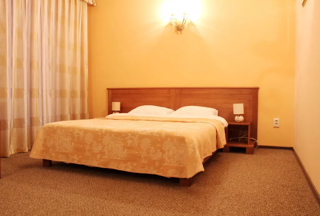 Мебель – одном номере 2 односпальные кровати, в остальных – двуспальная кровать, прикроватные тумбочки, зеркало, шкаф для одежды, журнальный столик, набор посуды.