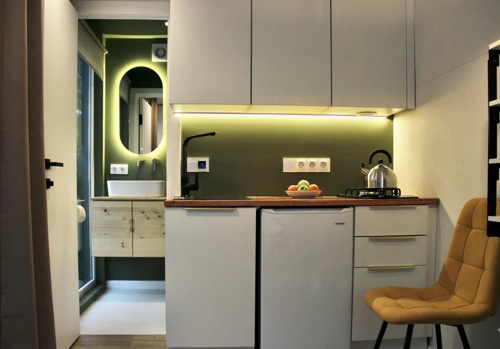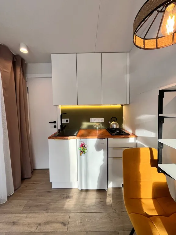 Дом площадью 30 квадратных метров состоит из кухни-гостинной и террасы с обеденной зоной. 15 кв.метров - теплая площадь и 15 кв.метров терраса